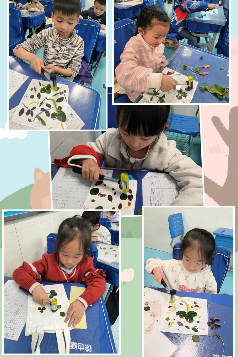 活动根据不同年级学生的认知特点,设计了阶梯式非遗实践课程。一年级学生化身“植物魔法师”,用锤子敲打花草,在白布上拓印出自然的纹理;二年级的孩子们则发挥创意,将植物拓印与绘画结合,创作出充满童趣的作品。三年级学生跟随非遗竹编传承人李加云学习编织技艺,制作出竹扇、杯垫等实用工艺品;四年级同学体验了苗族蜡染工艺,从绘蜡到浸染,亲身感受传统技艺的神秘与精妙。五、六年级学生则挑战高难度的螺钿工艺,将贝壳片镶嵌成精美的胸针和摆件,领略传统工艺的流光溢彩。