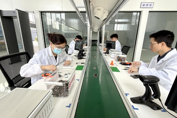 工作人员拆解手机闪存部件,送入破碎装置。来源:新华社