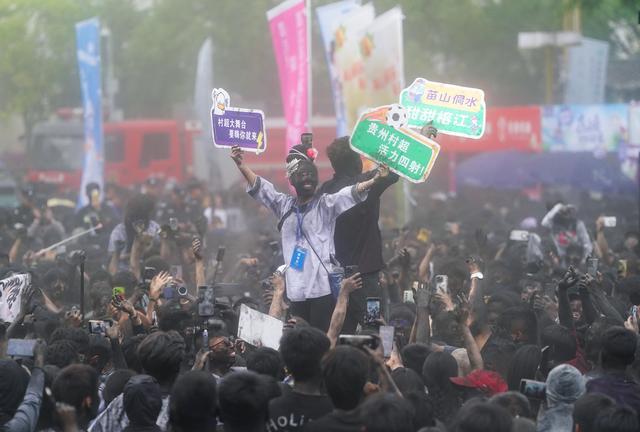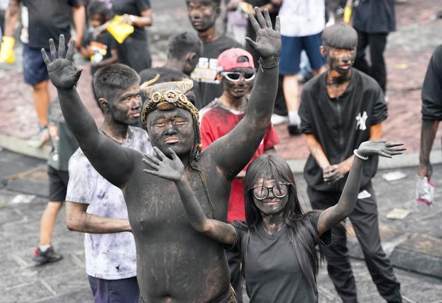 5月2日,来自贵州榕江县的“村超”推荐官在墨江参加“抹黑脸”狂欢。新华社记者 陈欣波 摄