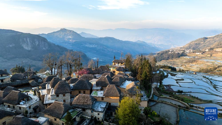 这是2月27日在云南省元阳县阿者科村拍摄的传统民居“蘑菇房”和梯田(无人机照片)。