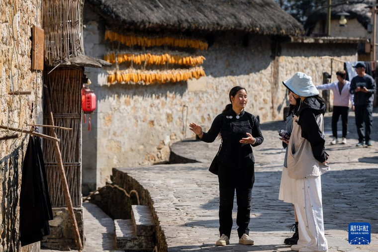2月28,在云南省元阳县阿者科村,村民导游高美华(左)在为游客讲解。