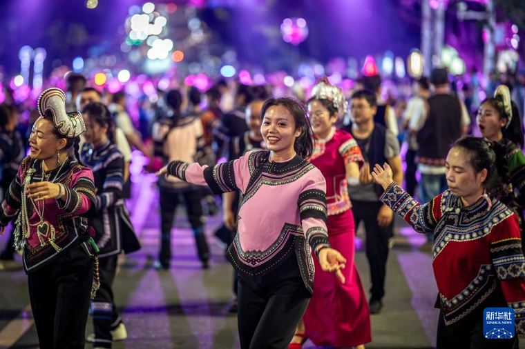 5月1日,在云南省红河县莲花大道,游客和当地群众在参加万人乐作舞会。