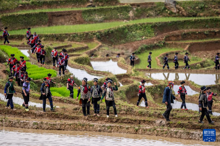5月2日,在云南省红河县甲寅村“开秧门”仪式上,村民身着民族服饰,沿着田埂踏歌而行。