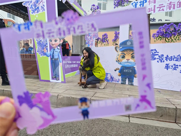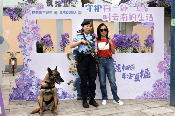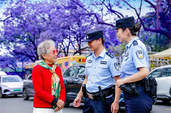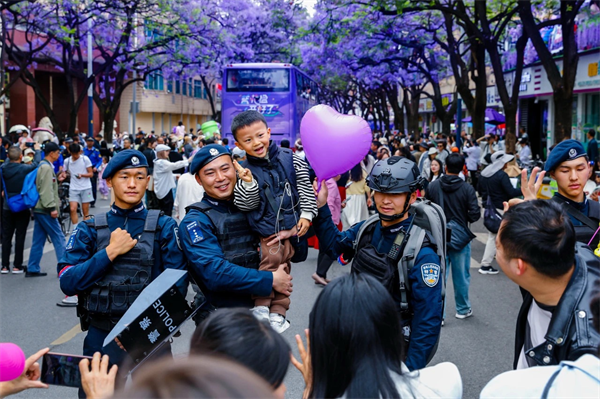 这是“守护有一种叫云南的生活”昆明公安“警景相随·平安夏楹”主题宣传活动中的温馨一幕。“五一”期间,昆明公安在教场中路持续开展活动,“警察蓝”用实力护航“赏楹季”。