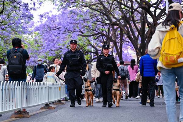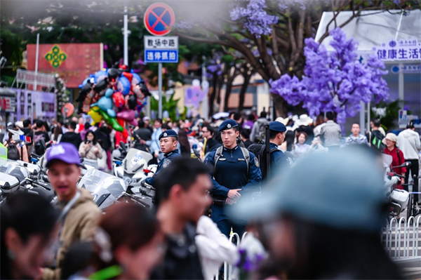为确保“五一”期间核心赏花区治安和谐稳定,昆明公安执勤警力开展连续12小时不间断巡逻,同时积极发动春城“红袖标”治安志愿者共同守护,最大限度提升街面见警率、管事率,给群众“看得见的安全感”。