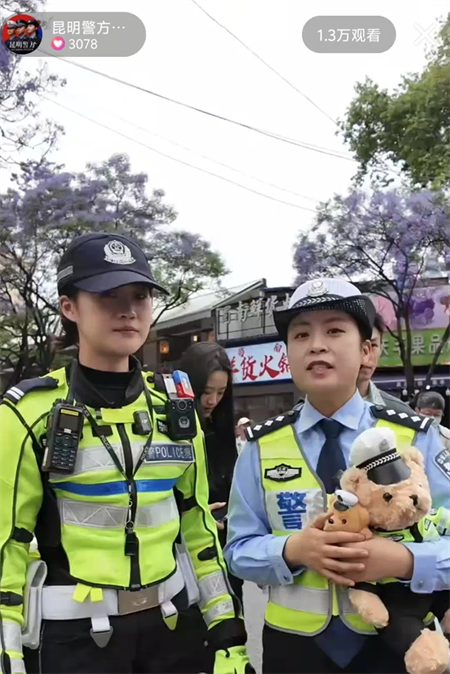 中午时分,警花抱着警熊走进直播间,带数万网友“云赏花”。