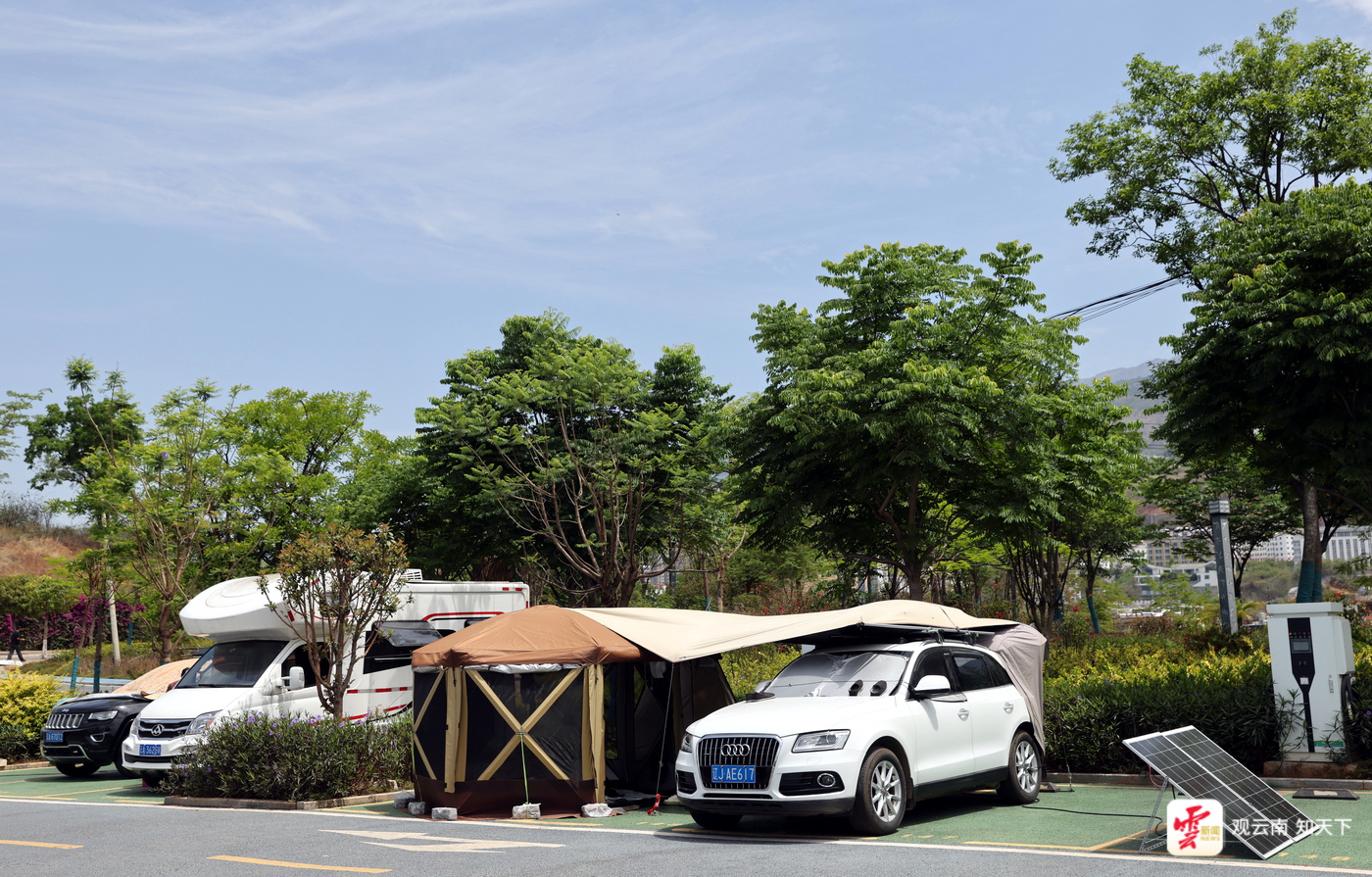 巧家县人民政府房车露营地里,新能源充电桩、公厕、自来水等设施一应齐全。营地绿树成荫、视野开阔,离湖滨岸边直线仅一两百米。贵A车牌的刘刚一人一车已在此扎营一个多月,他的帐篷里,除了生活用具还有两台小洗衣机和一辆小型折叠电动自行车。“这里停车免费,配套齐全,旁边不远处就可以买菜,网购还能送达,真的很方便。”退休后一直自驾旅行的刘刚表示,走过好多地方,云南让他产生了要留下来的想法。“蒙古的一位大哥过几天要来云南,我和他约好‘五一’节后到昆明周边找地方找房子。我俩在自驾圈发起旅居云南的活动,打算约几个好友一起在云南寻一个地方养老。”