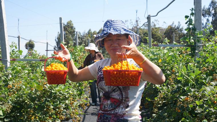 在采摘园里,色泽鲜亮的黄泡挂满枝头,与传统野生黄泡不同,这些经过精心培育的植株枝干光洁无刺,一簇簇如琥珀般晶莹剔透的果实垂坠枝头色泽鲜亮,格外诱人,轻轻触碰便落入掌心,采一把放入口中,酸甜多汁,风味浓郁。