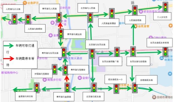 据介绍,昆明市一环内道路承接了昆明市的主要交通压力,区域内商圈、医院、学校、住宅聚集,人口密集、出行需求旺盛,一环内的交通压力日益增大,单路段绿波协调已不再满足日益增加的交通需求。相关交管大队经多次实地调研、数据分析,发现区域内纵向路段绿波容易受到横向道路的交通干扰,横向路段通行车辆运行不畅,经常“一灯一停”,且在流量较大时易出现路口“回溢”现象,严重影响区域内各路口正常的通行秩序;在路段车辆饱和度较高、出行高峰等情况下,信号灯时间和路段空间无法充分利用,区域内车辆无法高效通行。