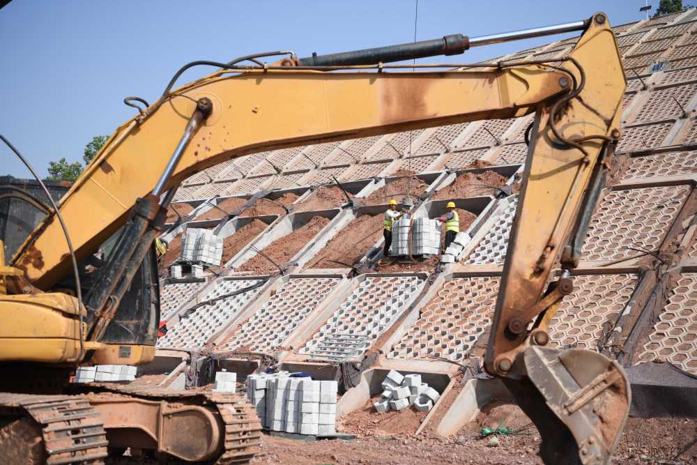 4月25日,中铁十一局工人在合武高铁安徽段金叶隧道口进行边坡施工。新华社记者 刘军喜 摄