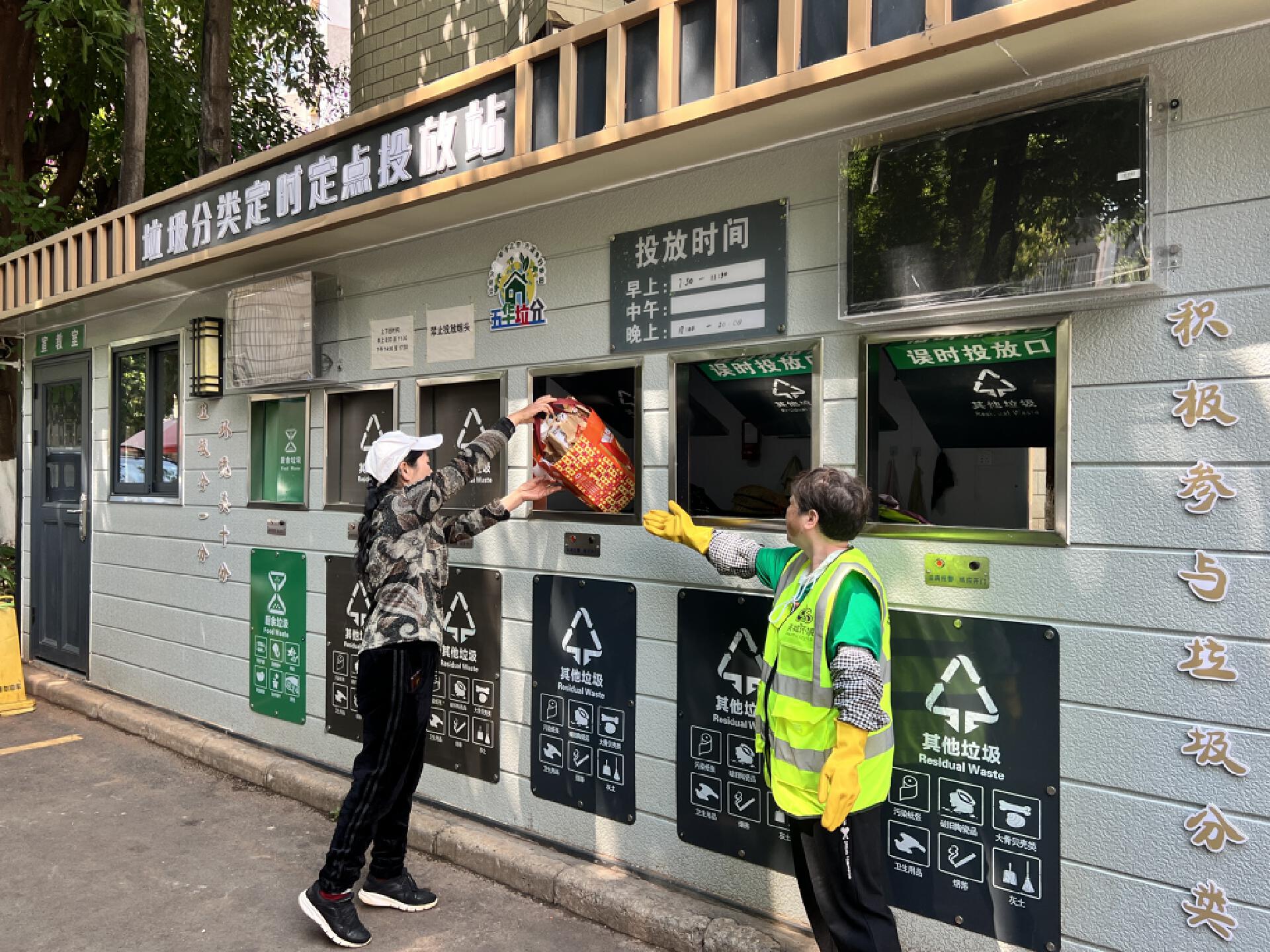 负责小区垃圾站运营的工作人员邱芳介绍,春晖小区垃圾分类工作是从2024年2月开展的,目前有15栋826户居民,建成分类垃圾站3座,除了厨余垃圾和其他垃圾分类箱外,在智能投放区还设置了有害垃圾及可回收物的投放区,居民可以选择自行投放或者在集中受理日进行线下兑换。“对于居民投放的可回收物,我们采用积分或现金兑换两种方式开展兑换,积分可以兑换一些基本的生活用品如洗衣液等,如果居民想要直接兑换现金,我们也会实时发布可回收物的价格进行现场回收。”邱芳说。