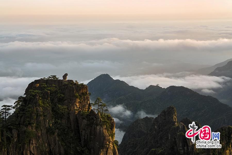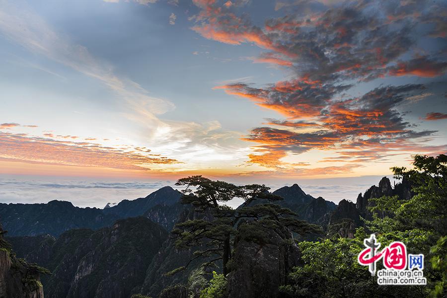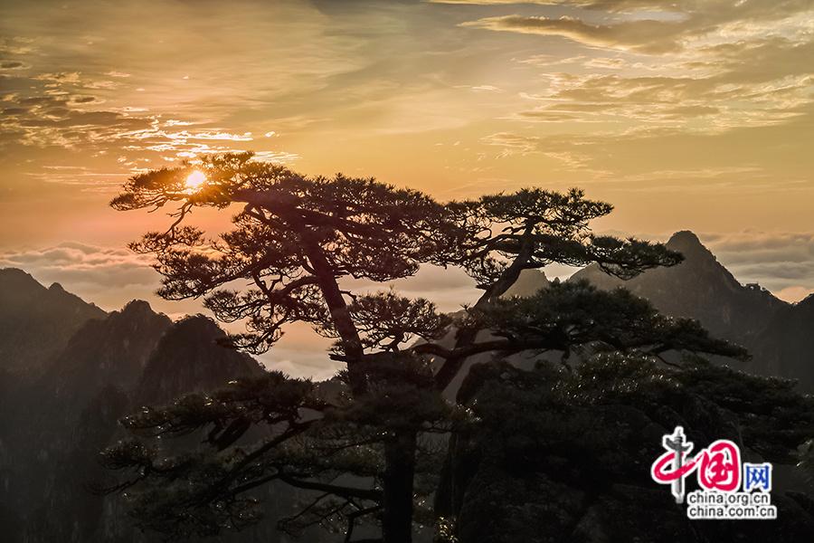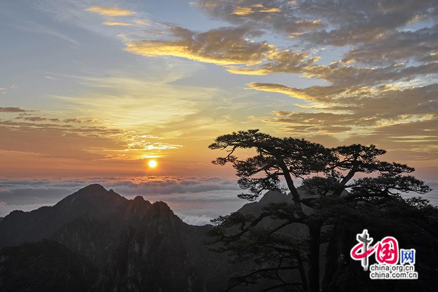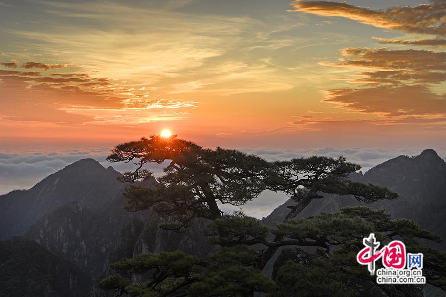 3、广角镜头:用广角镜头捕捉日出时的大场景,细节镜头则可聚焦霞光中的局部奇观(和黄山松、云海、朝霞同框)。(中国网 作者姚育青)