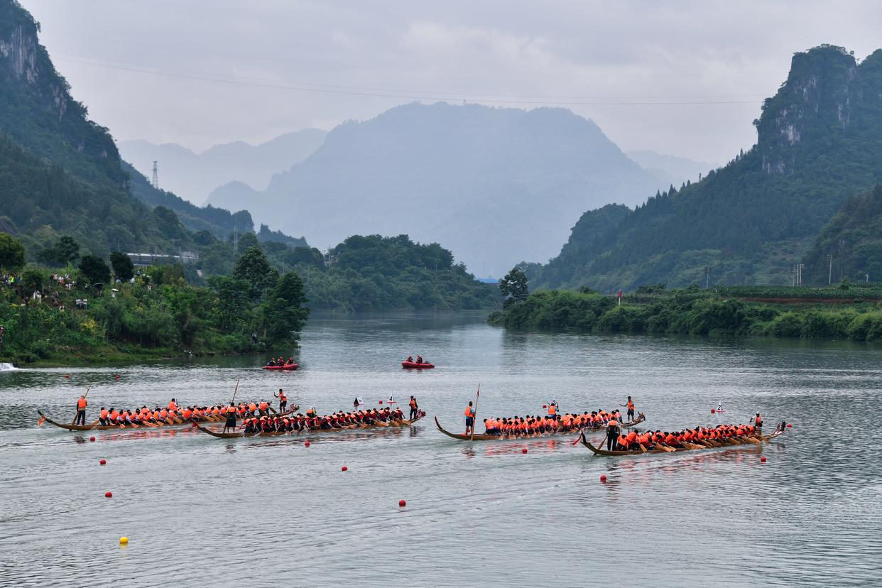 2025年5月31日,参赛队伍在贵州省铜仁市碧江区锦江水域赛龙舟。5月30日至31日,2025年“我们的节日·端午”主题文化活动暨中国传统龙舟大赛(贵州·铜仁·碧江)在贵州省铜仁市碧江区大明边城龙舟基地举行。来自铜仁市各区县的60支龙舟队齐聚锦江水域,进行为期两天的水上竞技。赛事期间,当地还举办了龙舟游江、民族文化展演、端午诵经典等活动。新华社记者 杨文斌 摄