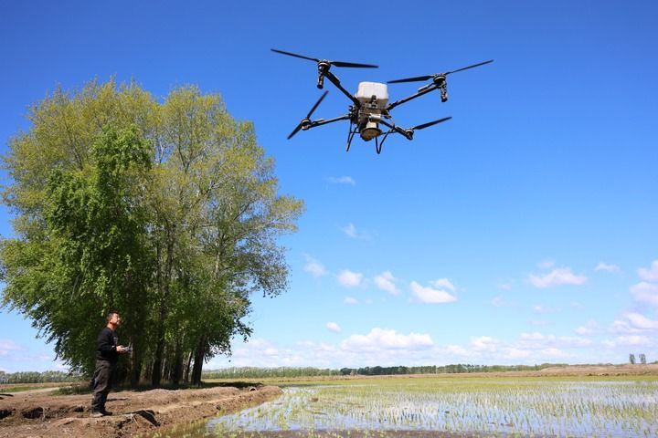 2025年5月21日,在北大荒集团黑龙江绥滨农场有限公司东井管理区,操作员操控搭载北斗导航系统的植保无人机,对即将施返青肥的地块进行打点。新华社发(李兴摄)