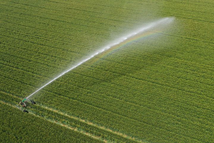 2025年5月7日,一台自走式喷灌机在河南省焦作市温县黄庄镇南韩村麦田间作业(无人机照片)。新华社发(徐宏星摄)
