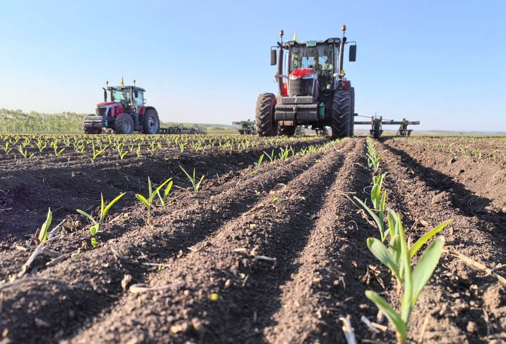 2025年5月23日,在北大荒集团黑龙江建设农场有限公司第三管理区,农机工人驾驶搭载北斗卫星导航自动系统的大型中耕深松机械,对刚出苗的玉米地块进行深松放寒作业。新华社发(许颖献摄)