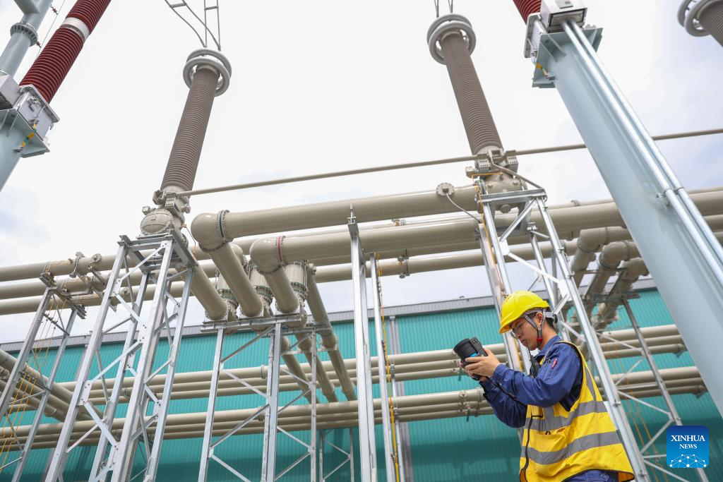A maintenance worker performs infrared temperature measurement on operational lines at the Yubei converter station of the Hami-Chongqing ±800 kV ultra-high voltage direct current transmission project, in southwest China's Chongqing Municipality, June 10, 2025. The State Grid Corporation of China on Tuesday announced the operation of the ±800 kV ultra-high voltage direct current transmission project linking eastern Xinjiang's Hami with southwest China's Chongqing Municipality.