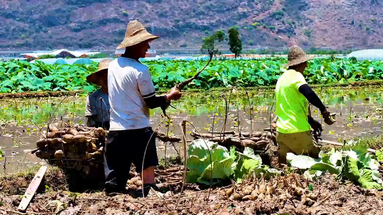 眼下,云南省弥勒市竹园镇的万亩莲藕迎来了丰收季。