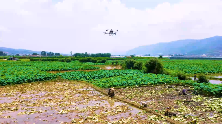 在万亩莲藕种植基地,一架架农业无人机穿梭于藕田之间,将新鲜采摘的莲藕吊运至田边的集散点。