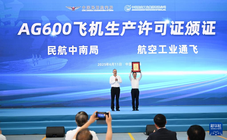 6月11日,在珠海中航通飞华南飞机工业有限公司,现场颁发了AG600飞机生产许可证。 新华社记者 邓华 摄