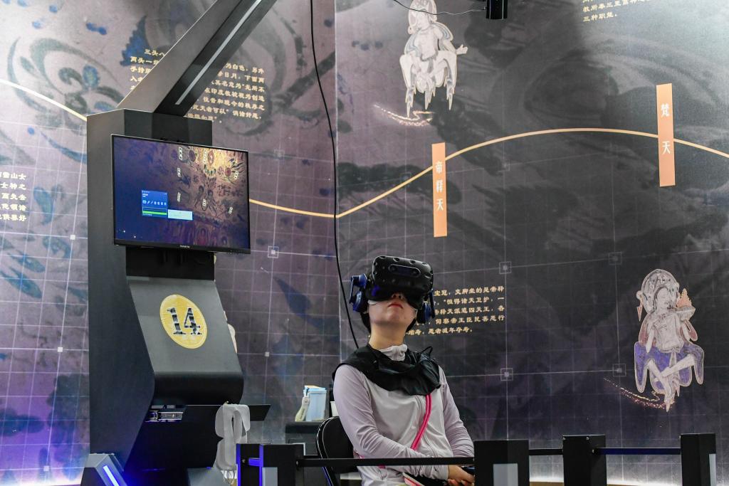 2024年7月22日,游客借助VR设备沉浸式游览莫高窟第285窟虚拟场景。新华社记者 郎兵兵 摄
