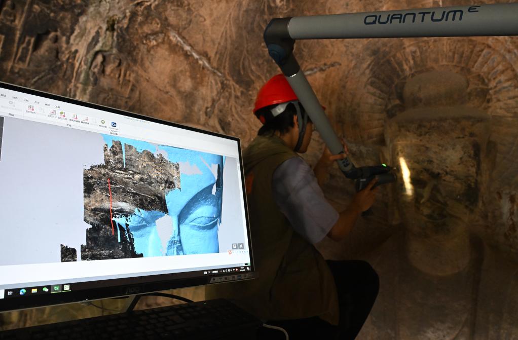 4月9日,武汉大学文化遗产智能计算实验室团队成员在龙门石窟魏字洞使用关节臂扫描仪对佛像进行数字化扫描。新华社记者 李嘉南 摄