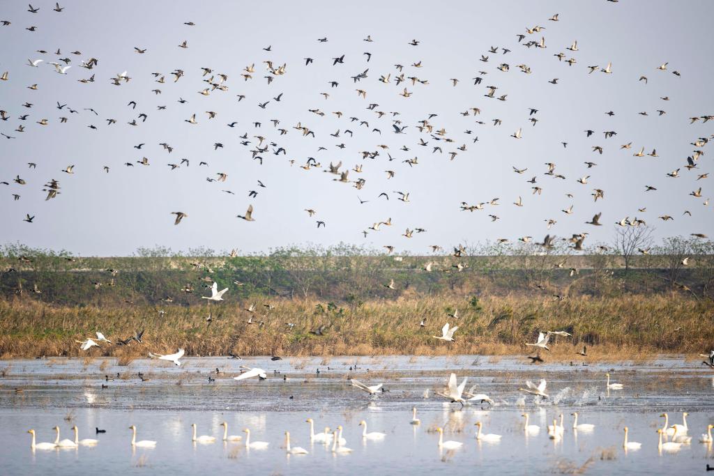 2024年11月12日在上海崇明东滩鸟类国家级自然保护区拍摄的候鸟。新华社记者 王翔 摄