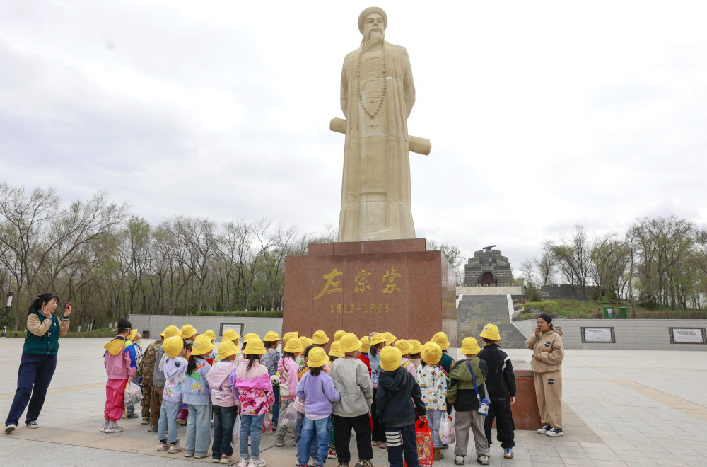 在乌鲁木齐总体国家安全观主题公园“一炮成功”广场,讲解员为幼儿园小朋友讲述左宗棠收复新疆的故事(2025年4月15日摄)。新华社记者 王菲 摄