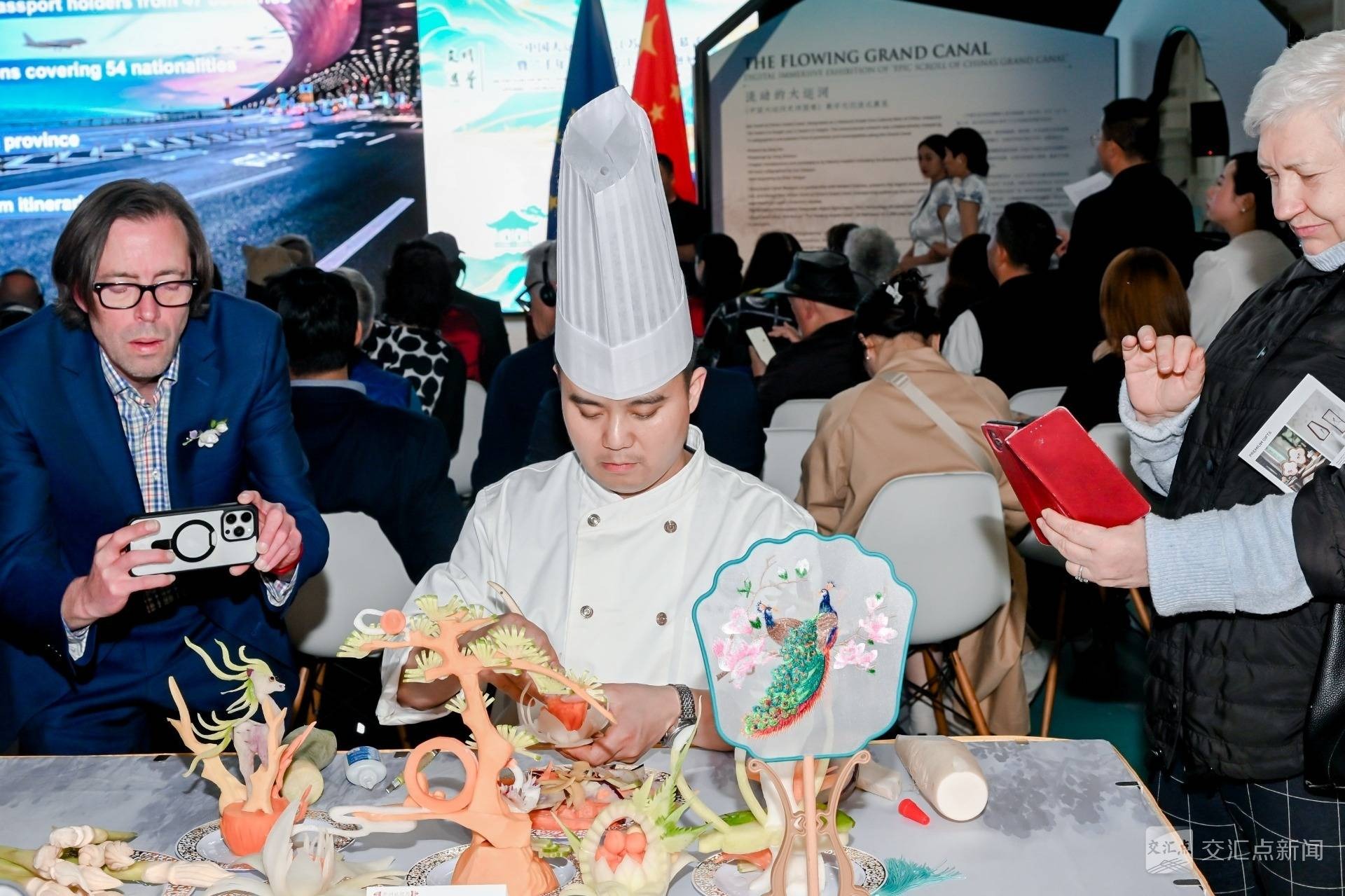 美食体验区则氤氲着江南烟火气。常州萝卜干、银丝面、封缸酒、东坡狮子头、麻糕等常州美食一字摆开。美食雕刻、非遗面塑与吹糖技艺、宋式茶点搭配蒙眼切豆腐的绝技,展现传统工艺的匠心。狮子头、萝卜干炒饭等淮扬滋味,引得中外宾客赞不绝口。知名演员宋佳的丈夫史蒂芬是比利时人,受妻子影响也是“中国迷”,他们逛展览、品美食,被狮子头“圈粉”。史蒂芬激动地说,“我想马上去中国!”