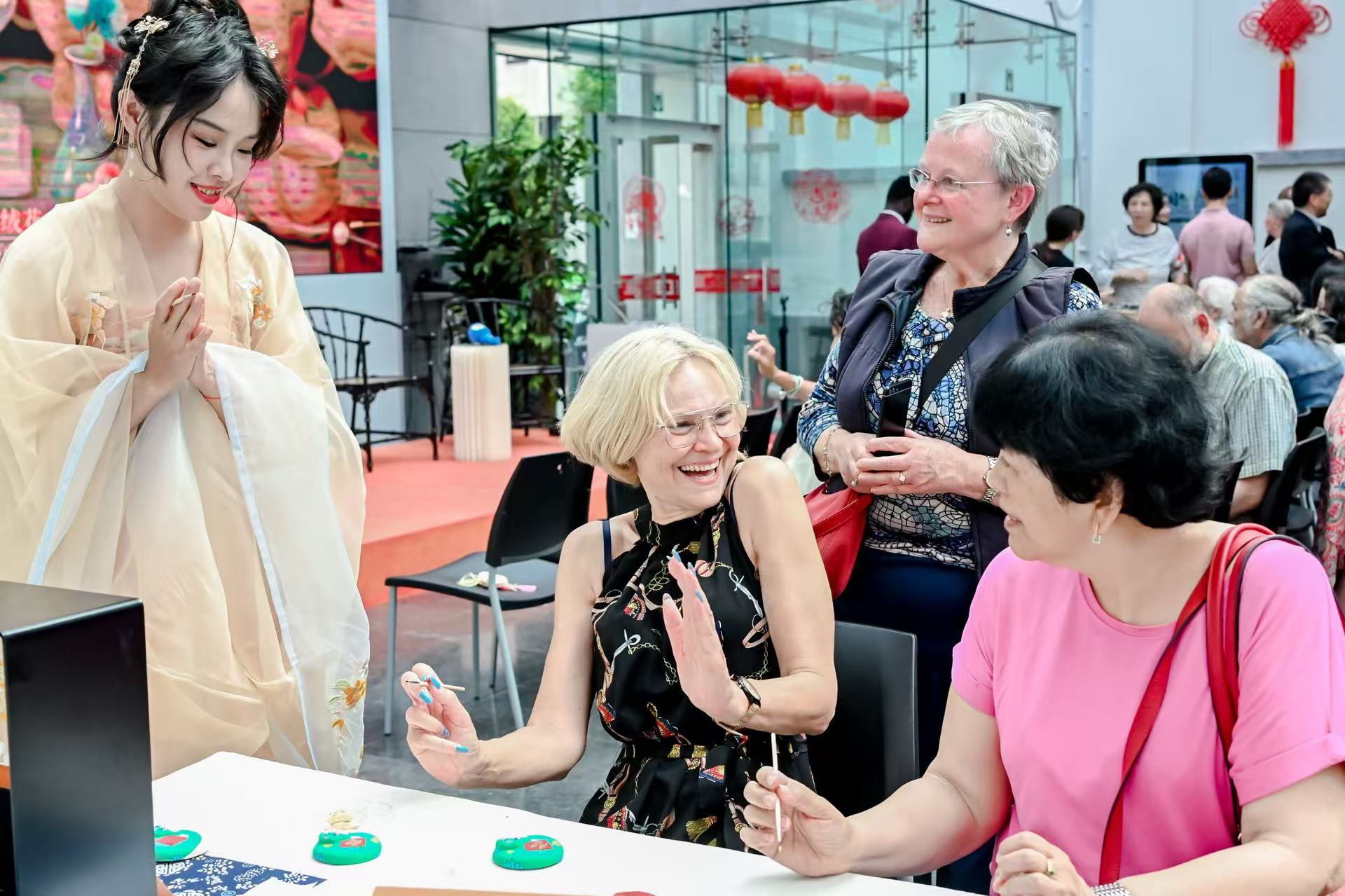 非遗展区集结苏州刺绣、扬州雕版印刷、常州孟河医派、扬州剪纸、惠山泥人、宜兴紫砂等技艺精彩亮相,与观众互动。传承人现场飞针劈线、演示针灸推拿,让观众亲身感受“一根丝线劈300份”的精微匠心与中医智慧。在雕版印刷展示台前,伊夫·莱特姆前首相和扬·布里尔斯主席满怀热情参与互动,他们认真地刷墨、覆纸、轻刷,手持拓印好的“和合如意”作品,笑着合影打卡。