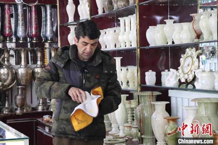 皮亚尔·卡里姆在店里擦拭玉器。(资料图)苟继鹏 摄