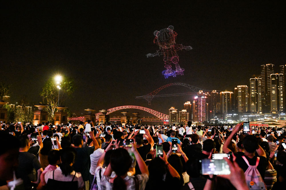 被无人机灯光秀点亮的城市夜空,成为展示大美重庆城市形象的多彩画布。