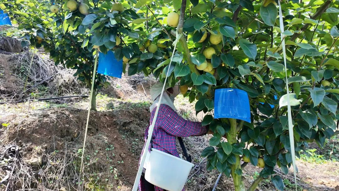 “2018年的时候,我到台湾去考察这个台湾蜜雪梨,我们这里的海拔、气候非常合适种植,我就来新华镇的八郎村租了这块地,种了120亩。”富宁兴鑫丰产林有限责任公司负责人苟光萍说道。据苟光萍介绍,台湾蜜雪梨是由台湾横山梨与日本新世纪梨杂交育的早熟梨新品种,不仅外形美观,而且肉质脆嫩、蜜香四溢、口感清爽甜润,其独特的白色褐变慢、抗氧化性能优越,加之消食降压、利尿等诸多功效,深受消费者青睐。该基地从2018年开始种植,2023年开始挂果,产量逐年提高,今年迎来了丰收。产品主要销往广西,一部分在本地销售,今年的产量预计50吨左右,收入60多万元。