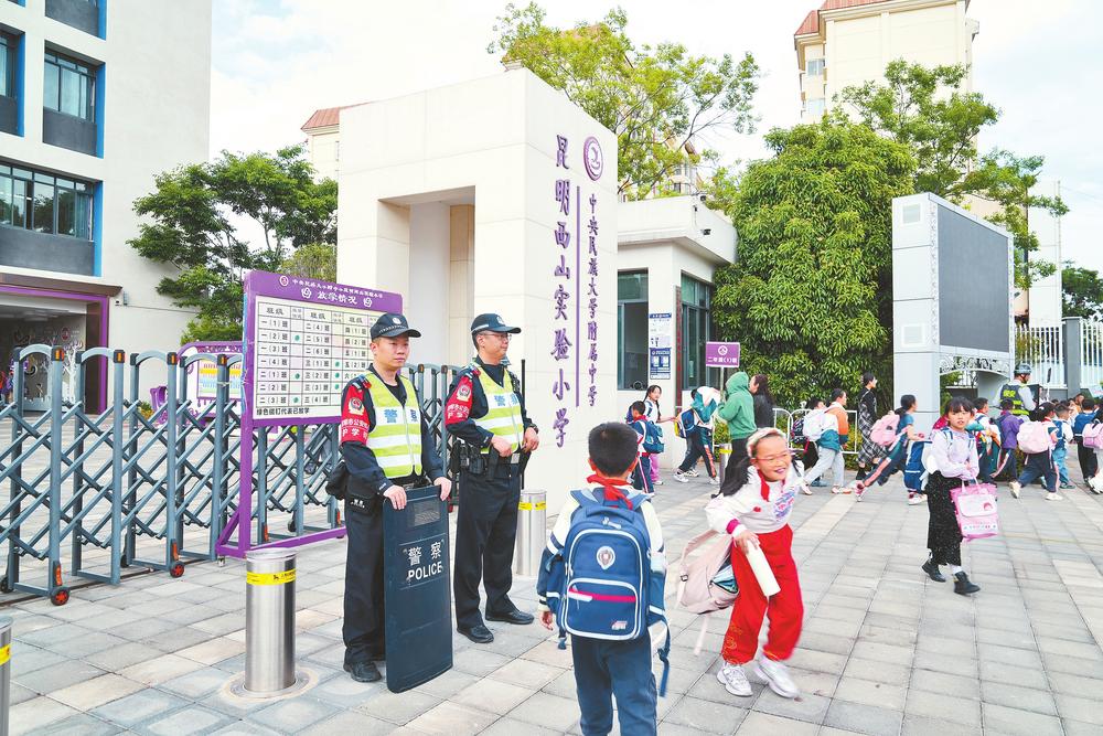 上学放学时段,交警与民警联动疏导交通,民警、安保人员、家长志愿者协同在校门口“护学岗”轮班值守,引导车辆即停即走;上课期间,社区红袖标治安志愿者穿梭巡逻,及时排查隐患……这是昆明市公安局西山分局前卫派出所辖区校园日常的安全场景。