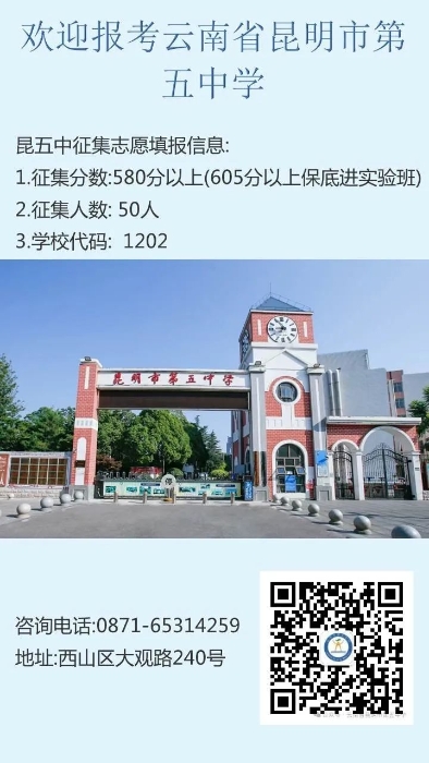③报考我校普高特色班的考生,必须在志愿表第三批次志愿栏内填报昆明市第五中学普高特色班,并正确填写代码“0501”。