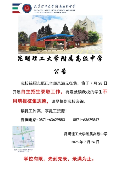 7月26日中午,昆明市主城区普通高中第三批次招生录取学校填报志愿录取结果公布。