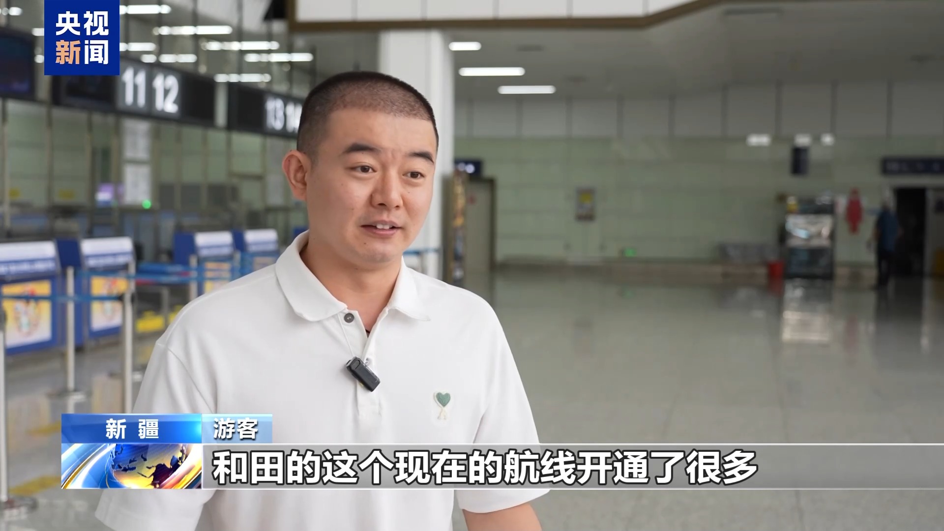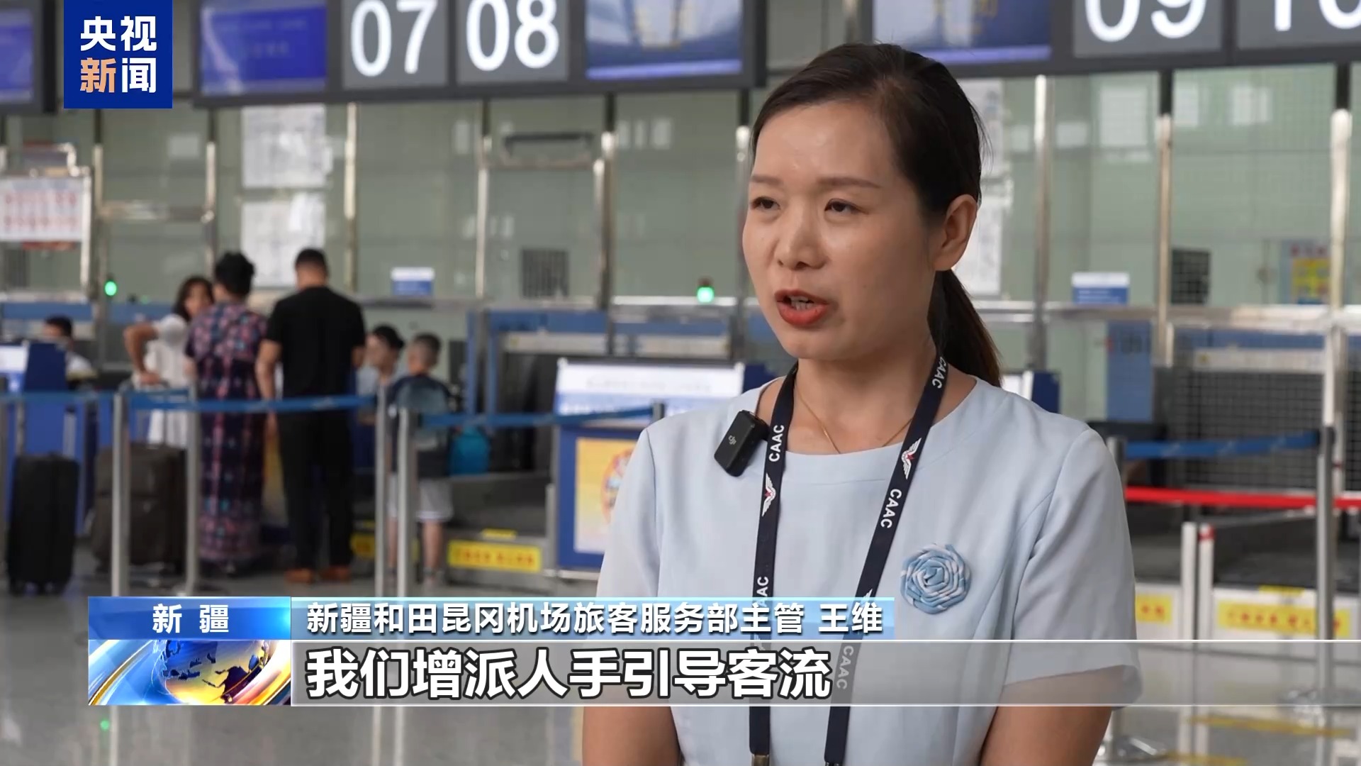 新疆和田昆冈机场旅客服务部主管 王维:今年旅客量增长特别明显。我们增派人手引导客流、优化值机流程,还加开了安检通道,就是为了让旅客走得快、走得舒心。