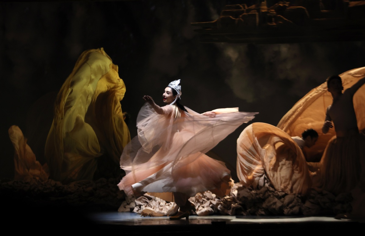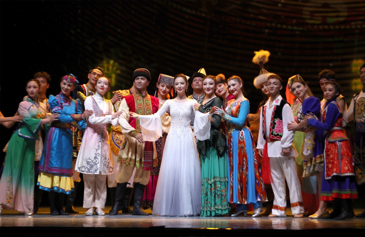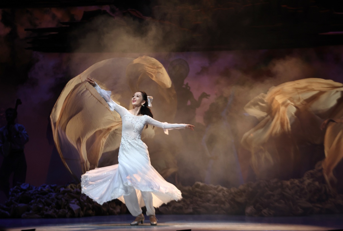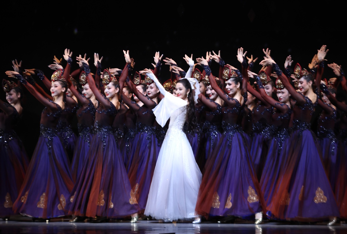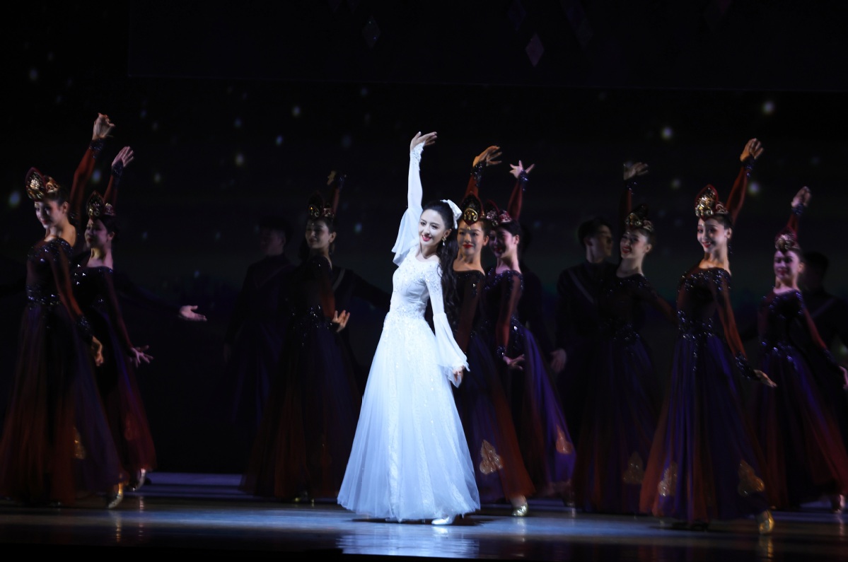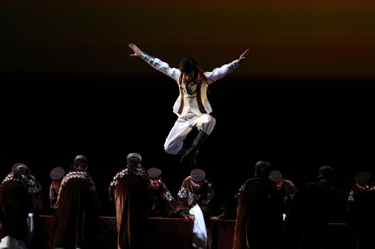 7月20日,在新疆人民会堂,演员在第七届中国新疆国际民族舞蹈节开幕舞蹈诗剧《在远方 在这里》上表演。中国日报 记者邹红 摄