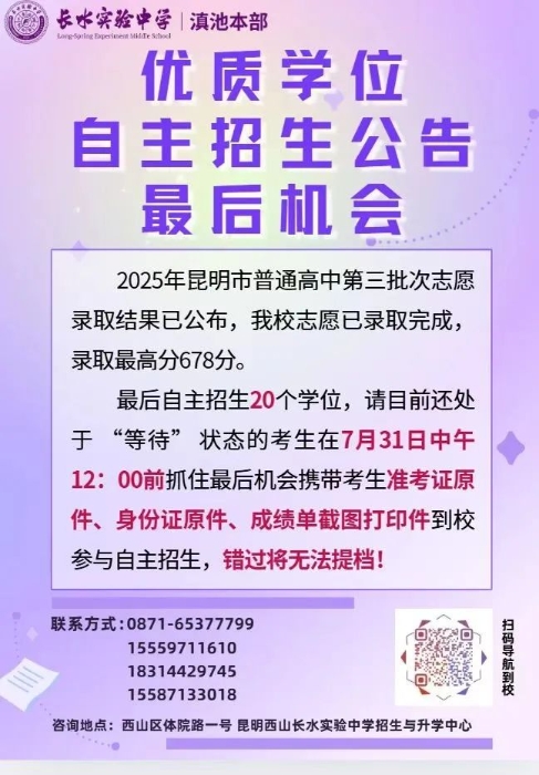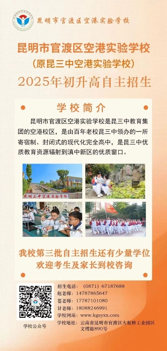今天,6686体育记者通过采访“2025昆滇名高中”招生负责人,了解到以下学校尚有少量名额,正在自主招生。建议尚未被录取的同学抓紧时间咨询。同学及家长朋友们可以点击校名进一步了解学校办学情况,同时通过“一键拨号”“一键导航”联系学校招生老师或到访学校,了解学校,妥当报名。