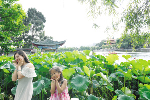 母女在大观公园拍“荷”趣照。