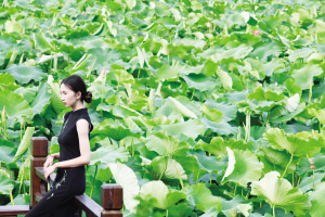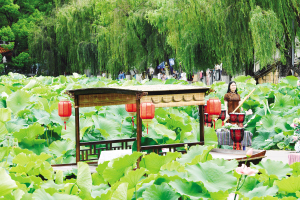 游客以荷为背景在大观公园拍国风照。