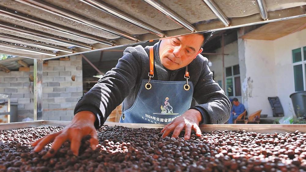 如今,乔玉光从“只会种咖啡”成长为“懂加工、会品咖啡”的行家,产品从3款增至18款,2024年销售额达1000万元。合作社社员从30户扩展到336户,覆盖周边村组;培育的50万株精品咖啡苗中,38万株免费提供给社员栽种,咖啡基地面积达7000多亩。“精品豆每吨比商业豆价高两三千元,但农户多是简单晾晒后出售,不懂好咖啡的诞生过程。”乔玉光说,“所以得加强加工工艺培训,哪怕40%的种植户懂行,群众收益也能更高。”