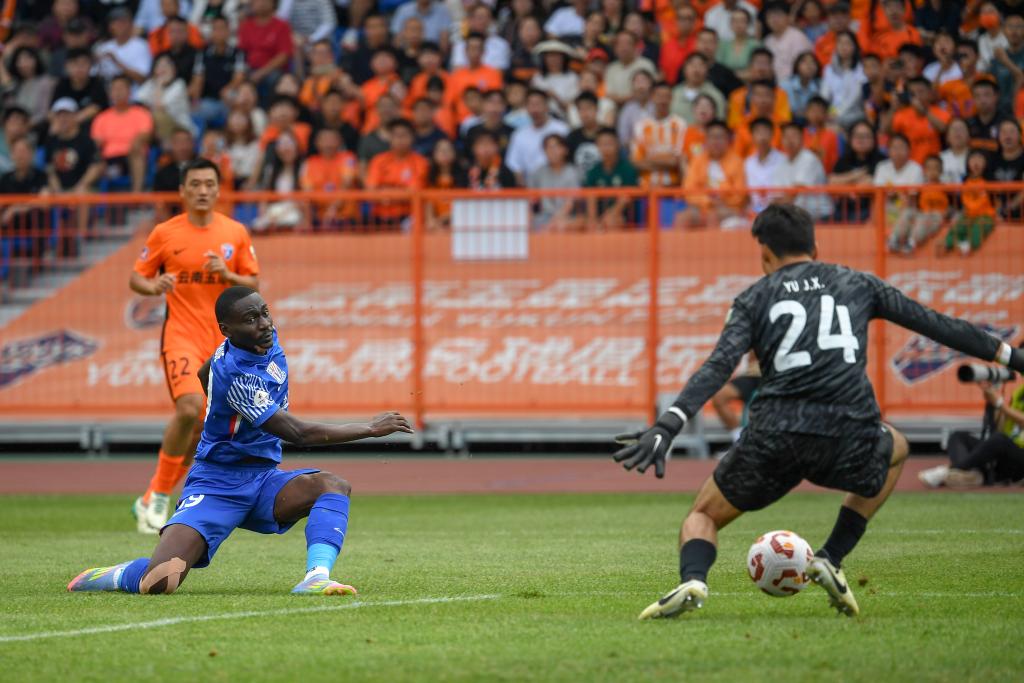 8月2日,上海申花队球员阿苏埃(前左)在比赛中射门。新华社记者 彭奕凯 摄