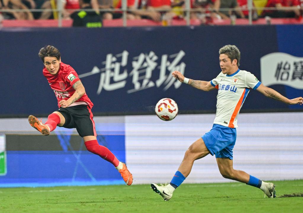 8月2日,成都蓉城队球员韦世豪(左)在比赛中射门。新华社发(尹钢摄)