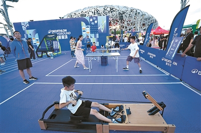 国家体育场鸟巢所在的奥林匹克中心区,早已是商户和消费者的青睐之地。8月7日恰逢第17个“全民健身日”前夕,以“AI尚体育 悦动一夏”为主题的第十六届北京奥运城市体育文化节暨第六届“8·8”北京体育消费节在这里举办。嘉年华为期四天,举办了17项体育赛事和活动,涉及专业竞技、文化表演、互动体验等多个方面。市民不仅能体验数智铁三、电子竞技自行车、AI网球学练等创新项目,还能参与“大家运动汇”全民健身体验活动。超过80家商户积极参与,涵盖了体育科技、户外用品、体育旅游、体育运动康复、体育服务、文创产品、商业百货、金融服务等多个领域。