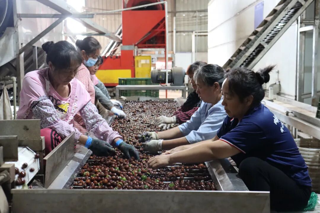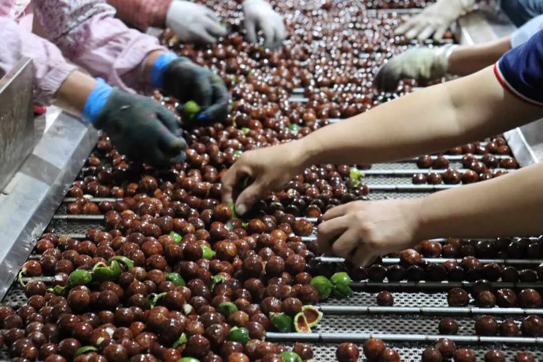 每年8月至10月是坚果集中采收期,也是加工厂初加工的关键阶段。工人们熟练操作设备,将带青皮的坚果送入脱壳机去皮,再经清洗设备去除杂质、送入烤房烘干,最后分级筛选,完成初加工。10月至次年2月则转入精细加工,通过开口、杀青、入味、二次烤干、包装等工序,生产出香草、奶香、原味三种口味的坚果产品,发往全国各地,满足不同消费者需求。