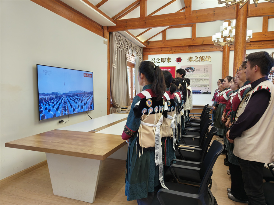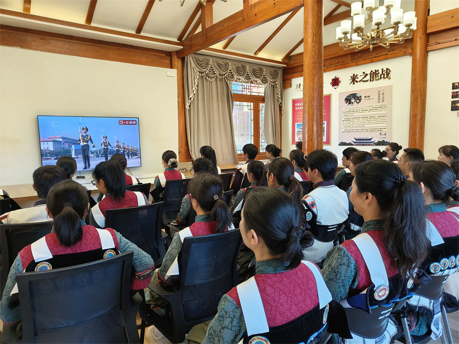 在丽江古城博物院(木府)内,当纪念中国人民抗日战争暨世界反法西斯战争胜利80周年大会直播屏幕中国歌奏响时,大家齐刷刷起身,眼里满是自豪敬仰之光。