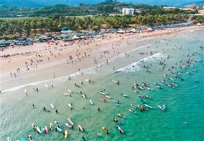 除了纷至沓来的游客,众多大型国际赛事也选择万宁作为举办地。自2010年首届国际冲浪赛破浪启航,世界长板冲浪锦标赛、中国冲浪公开赛等高规格赛事相继落地,万宁成了名副其实的世界重要冲浪目的地。今年,万宁计划举办世界冲浪巡回积分赛、中巡赛万宁市男子高尔夫球公开赛等45场国际级、国家级、省级、市级赛事,并同步推出冲浪文化展、体育装备市集等活动,助力打造“中国冲浪之都、世界冲浪胜地”。