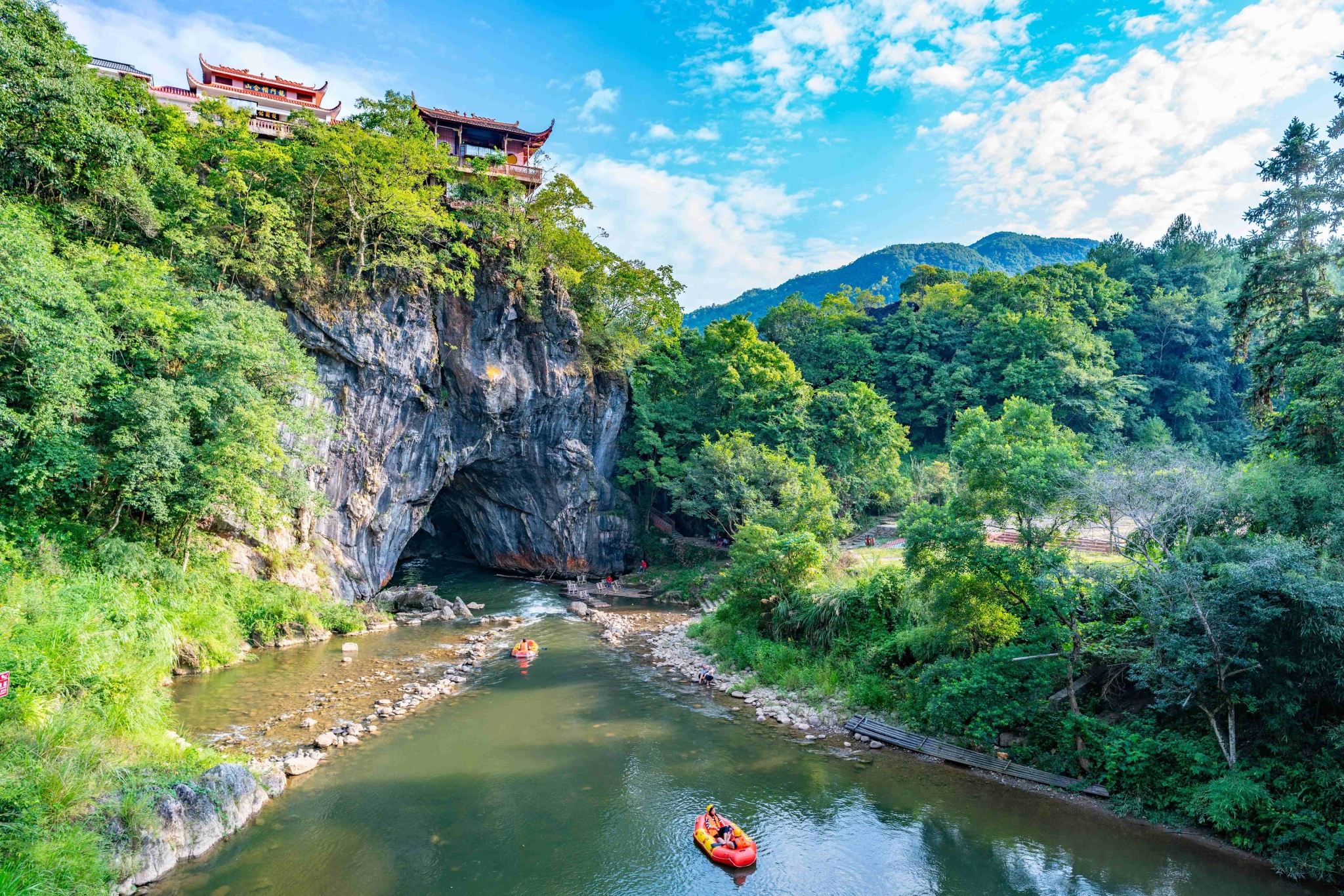走近才知道,帽合山之奇,不在于远望,而在于近观。远远看,只知它绿树葱茏,秀丽如画,山顶建筑增添了几分人文厚重感。走到近处,只见山的下部竟然是一个大溶洞,碧波滚滚的汀江从洞中穿过,匆匆南下,难怪此地叫“龙门”。