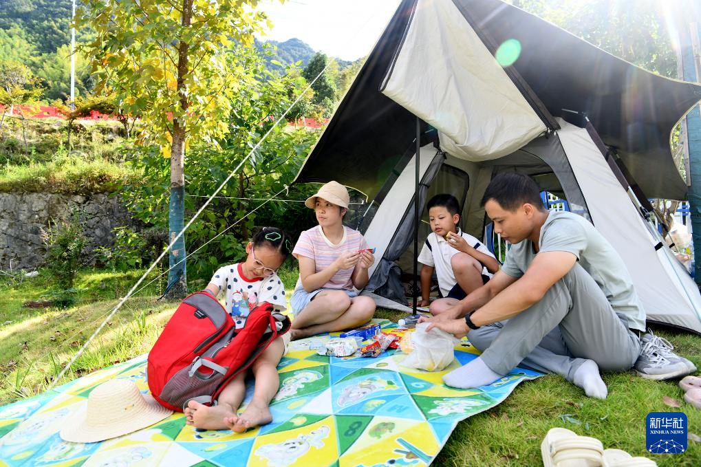 8月29日,在湖北省咸宁市通城县黄龙林场,游客搭起帐篷,享受露营的乐趣。